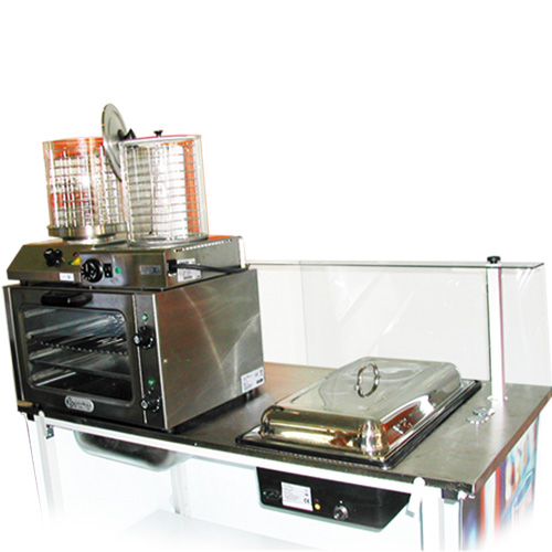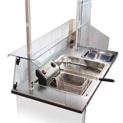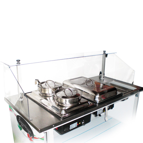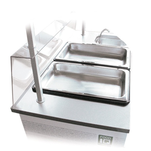 Deze flexibele toepassing biedt verschillende mogelijkheden voor warme en koude proeverijen. Een professionele koelbox (tot min 18 ºC) is geïntegreerd en heeft extra uitsparingen voor 2/1 GN en 1/2 GN. De onbreekbare hygiënebeschermer is uitgerust met zijpanelen en een bovenpaneel.